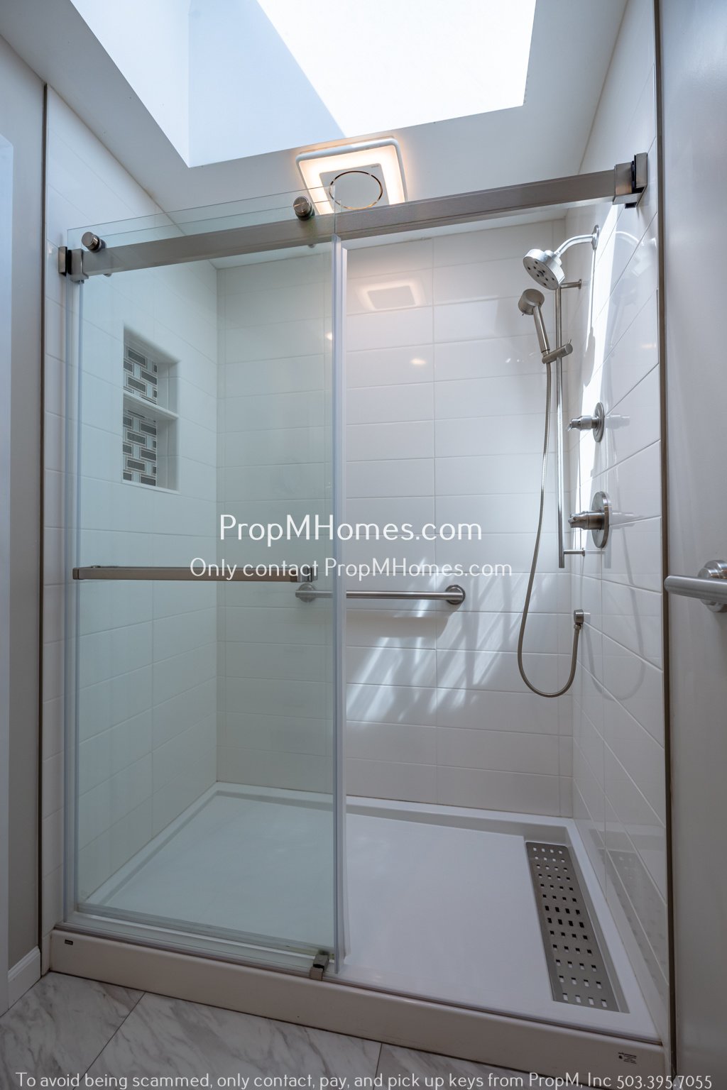 -Two bathrooms: one with shower/tub combo and detachable showerhead, second off laundry with standing shower