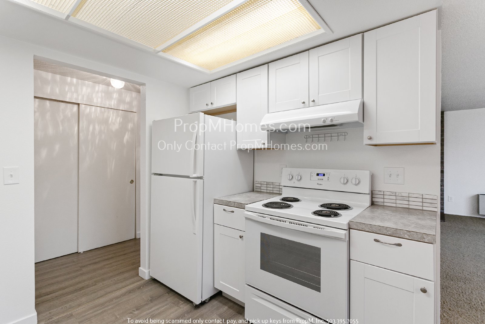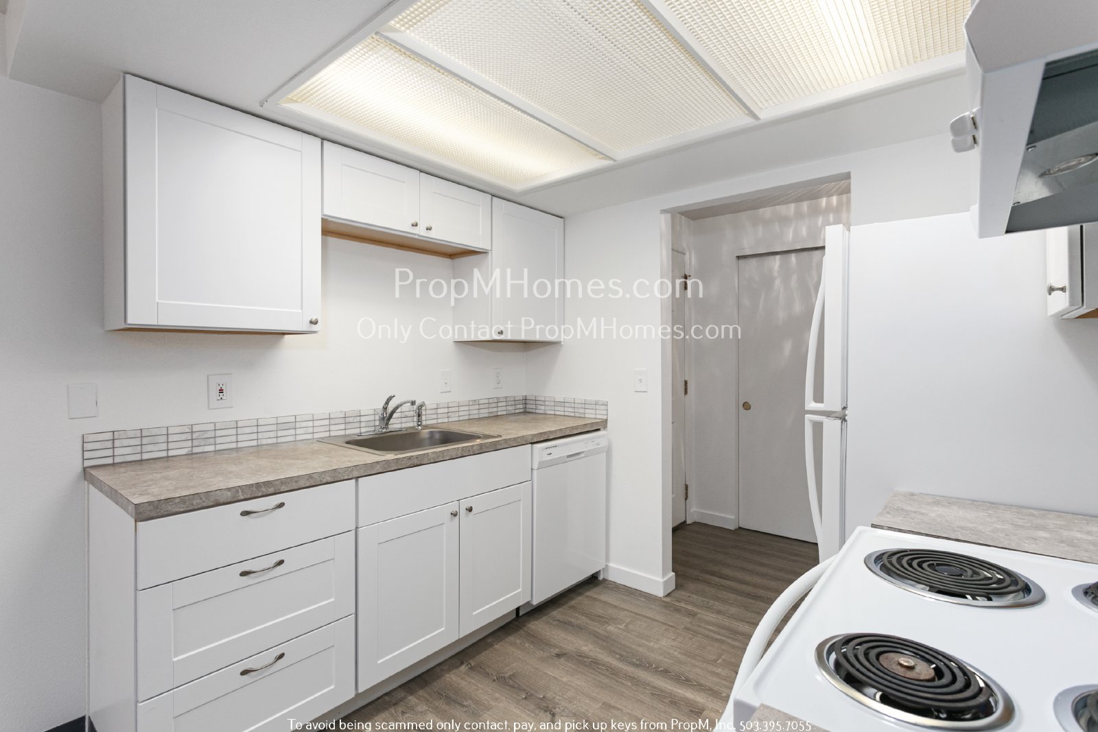 -Open galley kitchen with white cabinetry and durable laminate countertops
