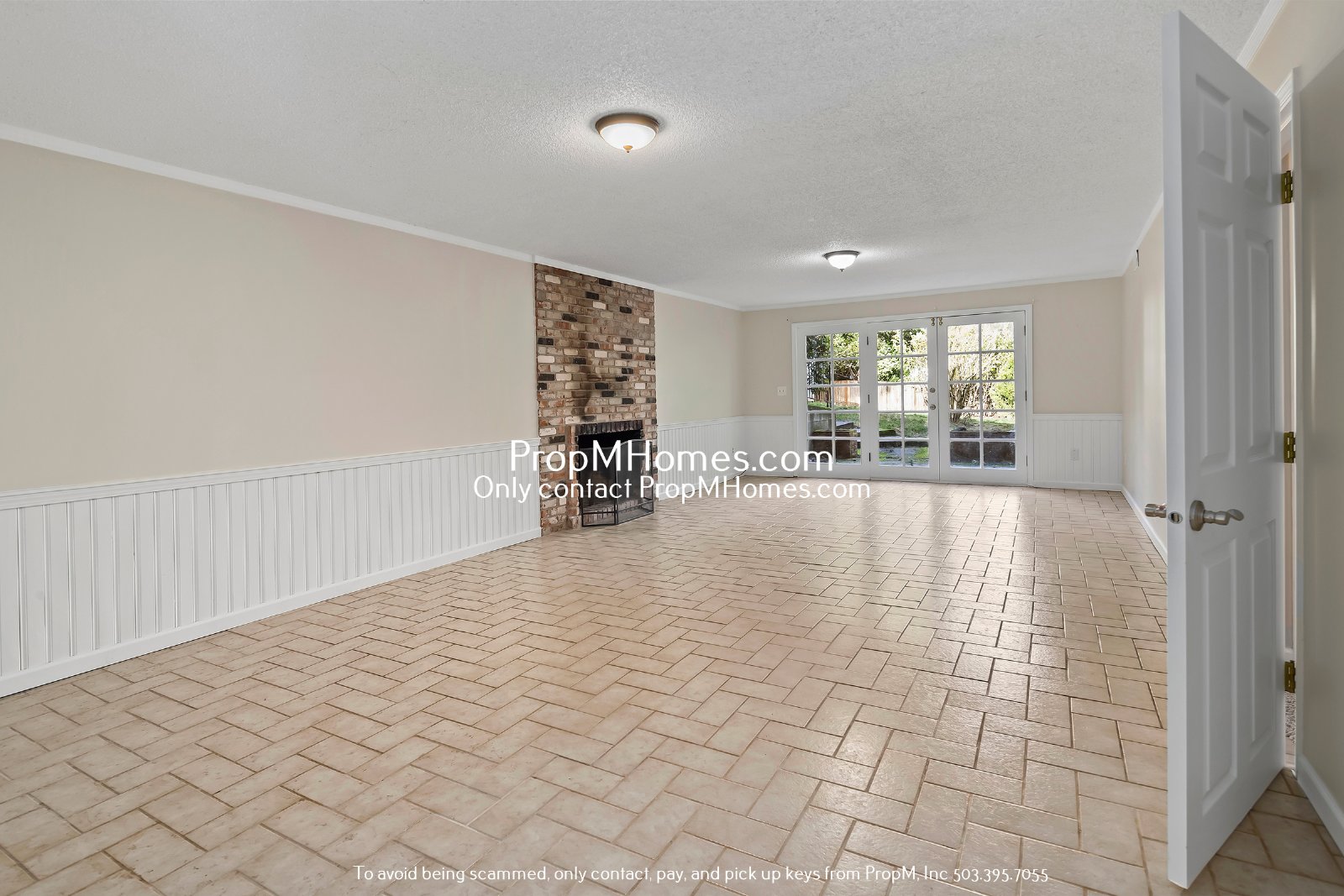 -Second living area downstairs with brick fireplace and French doors to the backyard