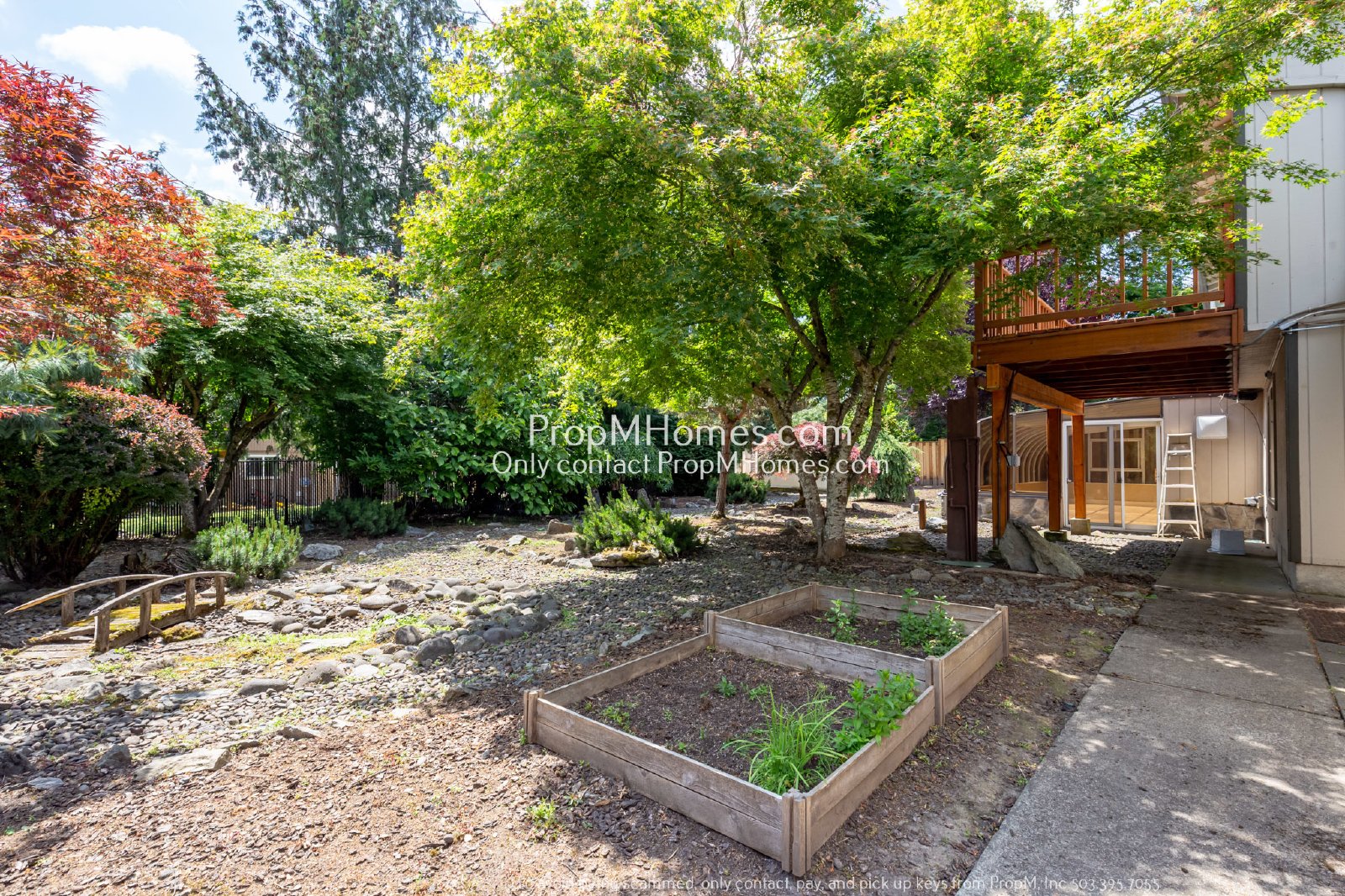 -Beautifully landscaped backyard with flourishing plants and stone walkways