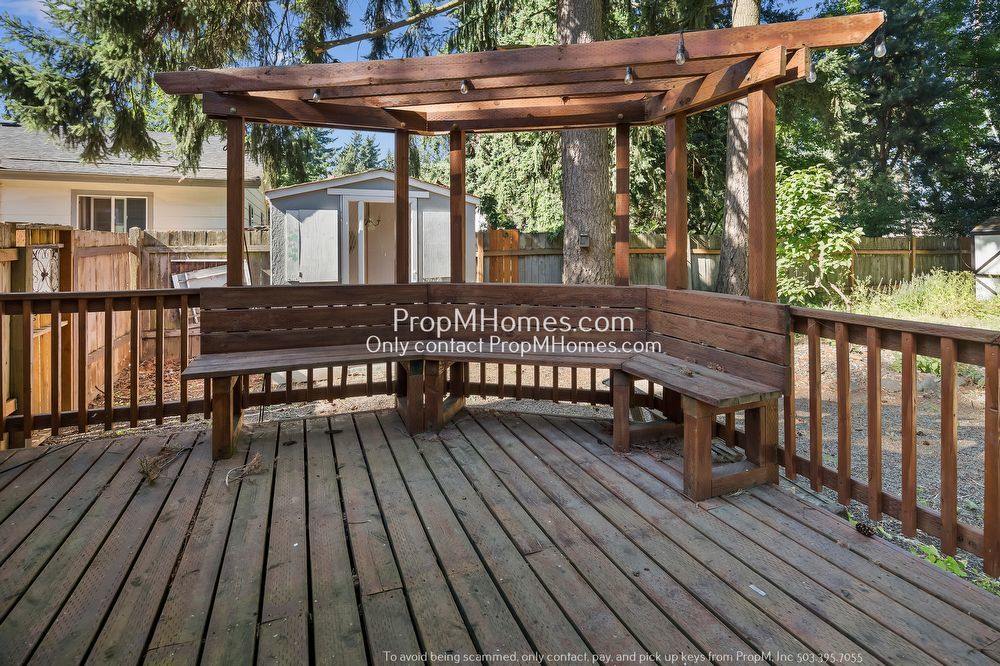-Fenced backyard with raised wood deck and built-in bench—perfect for entertaining or relaxing outdoors