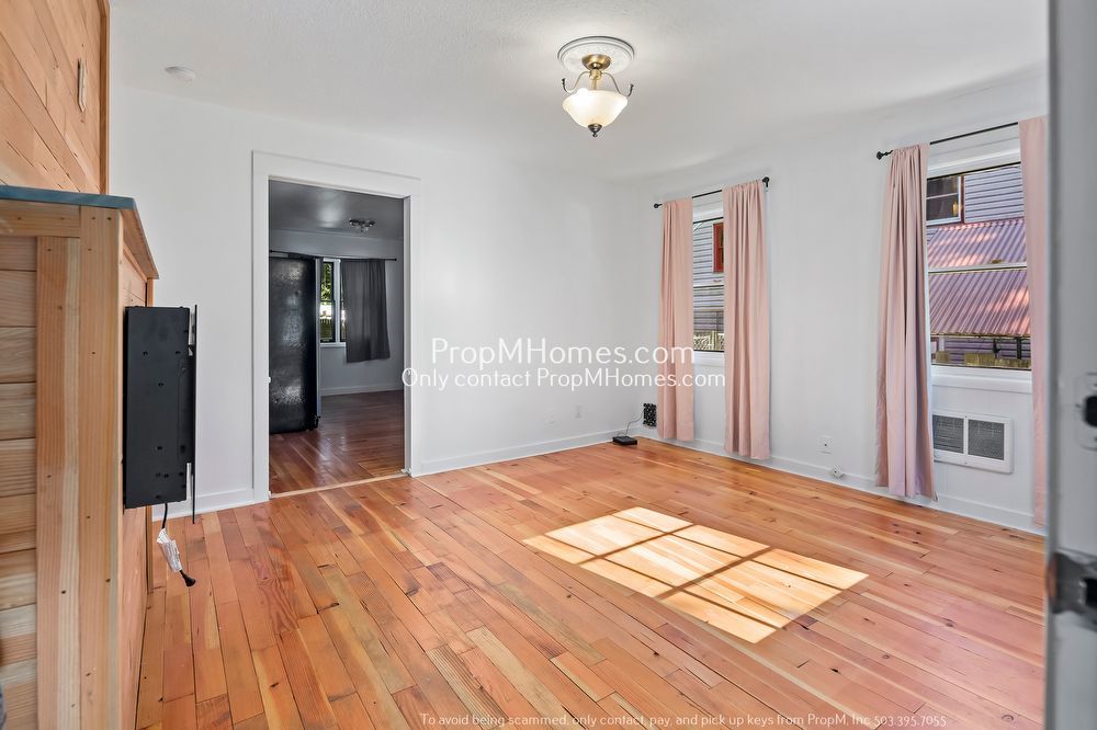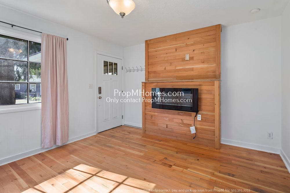 -Spacious and inviting living area with hardwood floors and an electric fireplace framed by a wood surround
