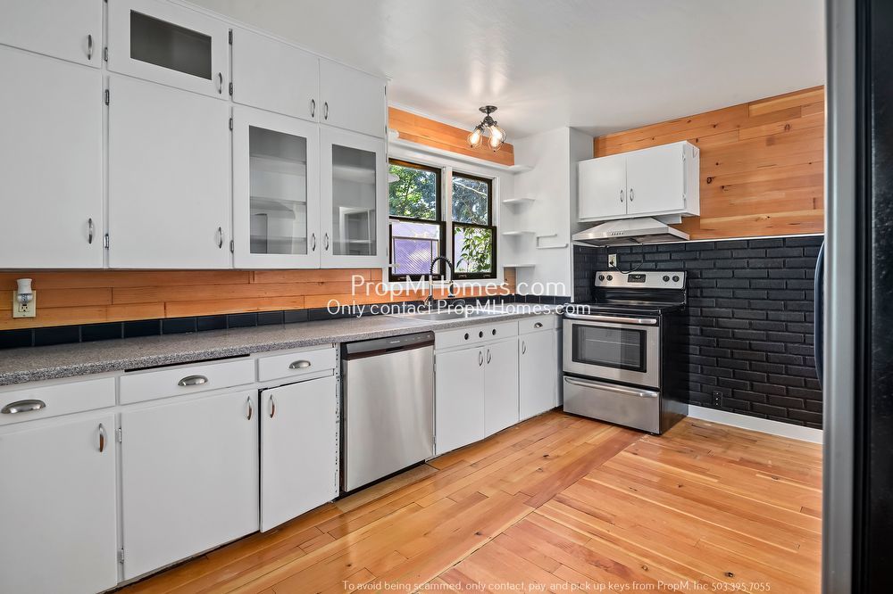 -Stainless steel appliances including refrigerator, dishwasher, and electric stove/oven