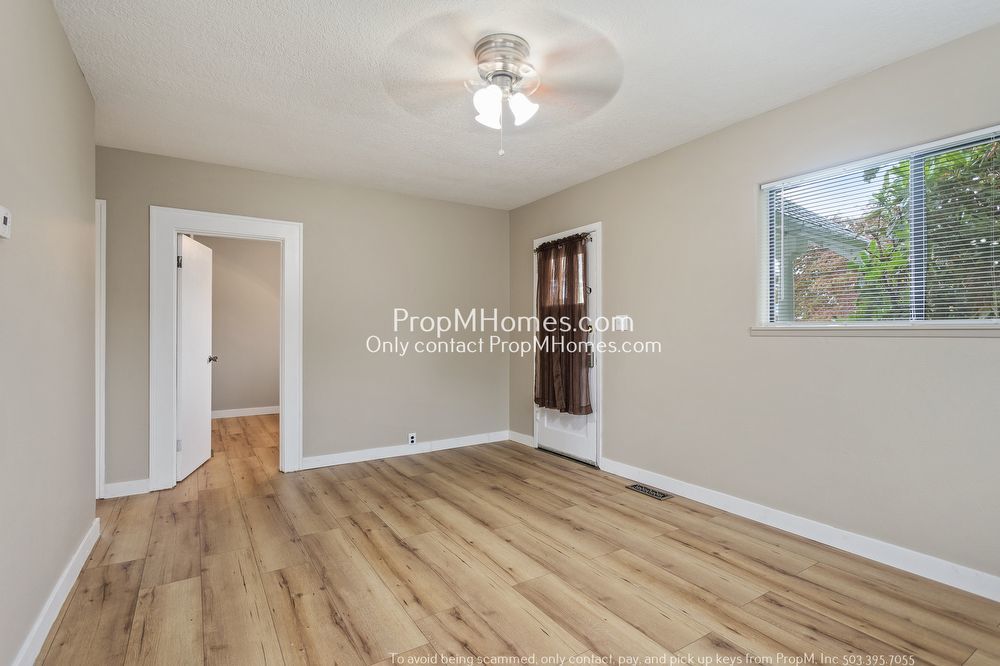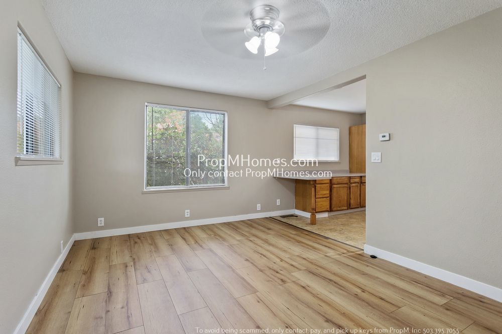 -Spacious living area with hardwood-like flooring, tall windows for natural light, and a ceiling fan