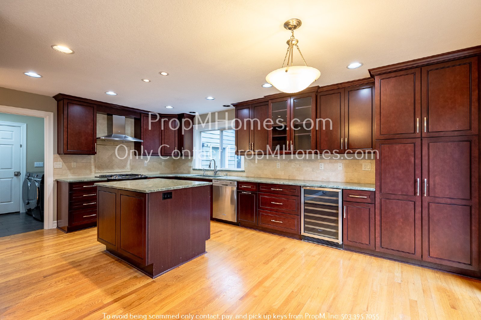 Stainless steel appliances: refrigerator, microwave, dishwasher, gas stove/oven, and wine refrigerator