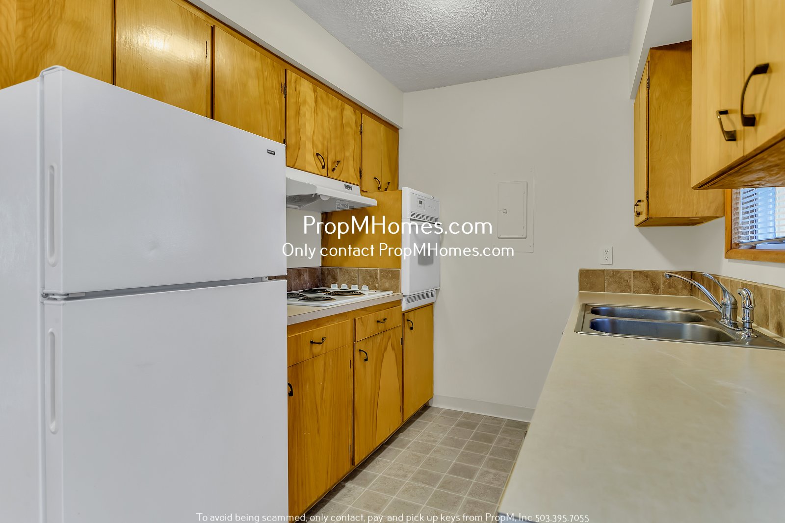 -Bright kitchen with warm wood cabinetry, laminate countertops, and white appliances (refrigerator, electric stove, oven)