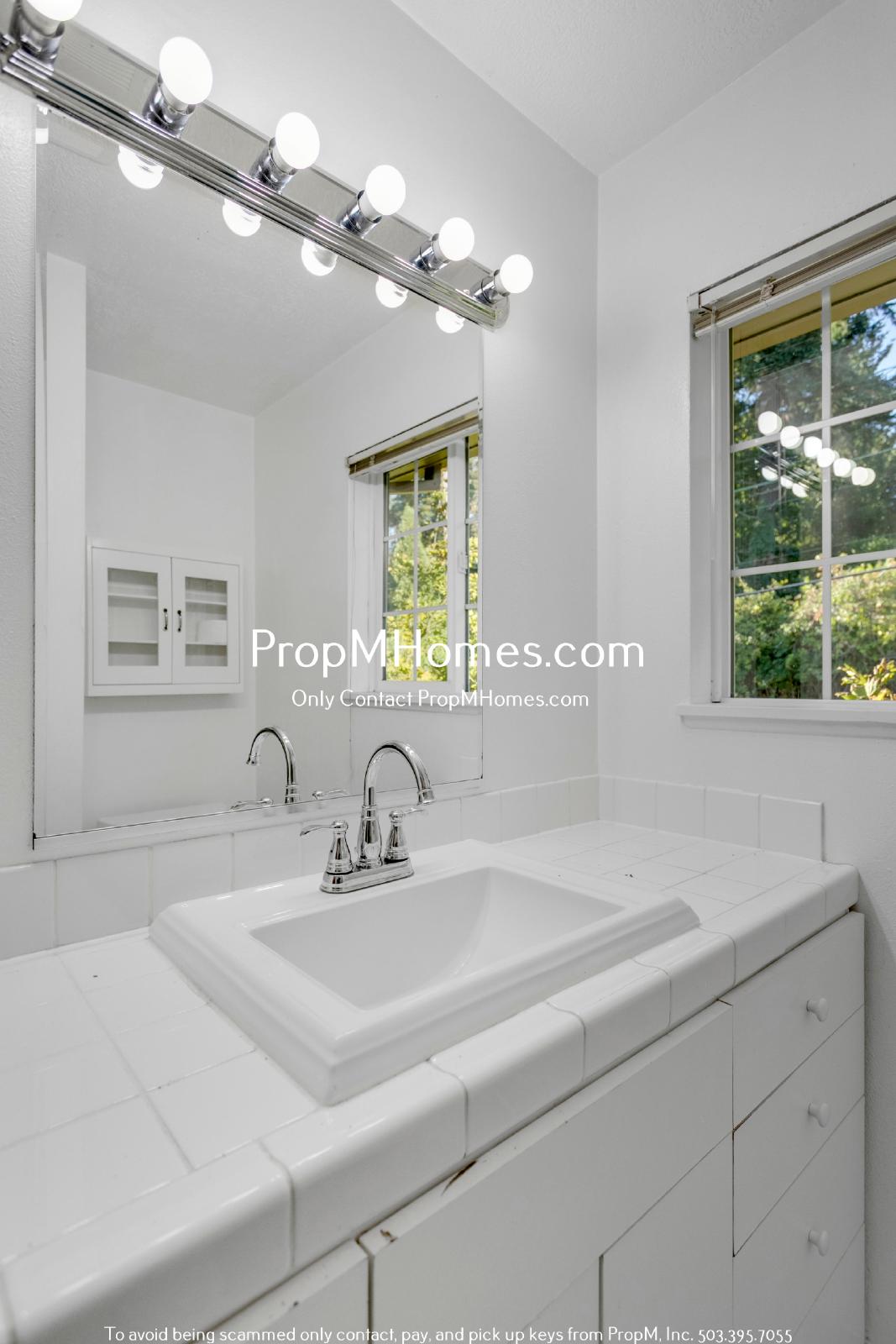 -Bathroom features a large vanity with dual sinks and updated fixtures