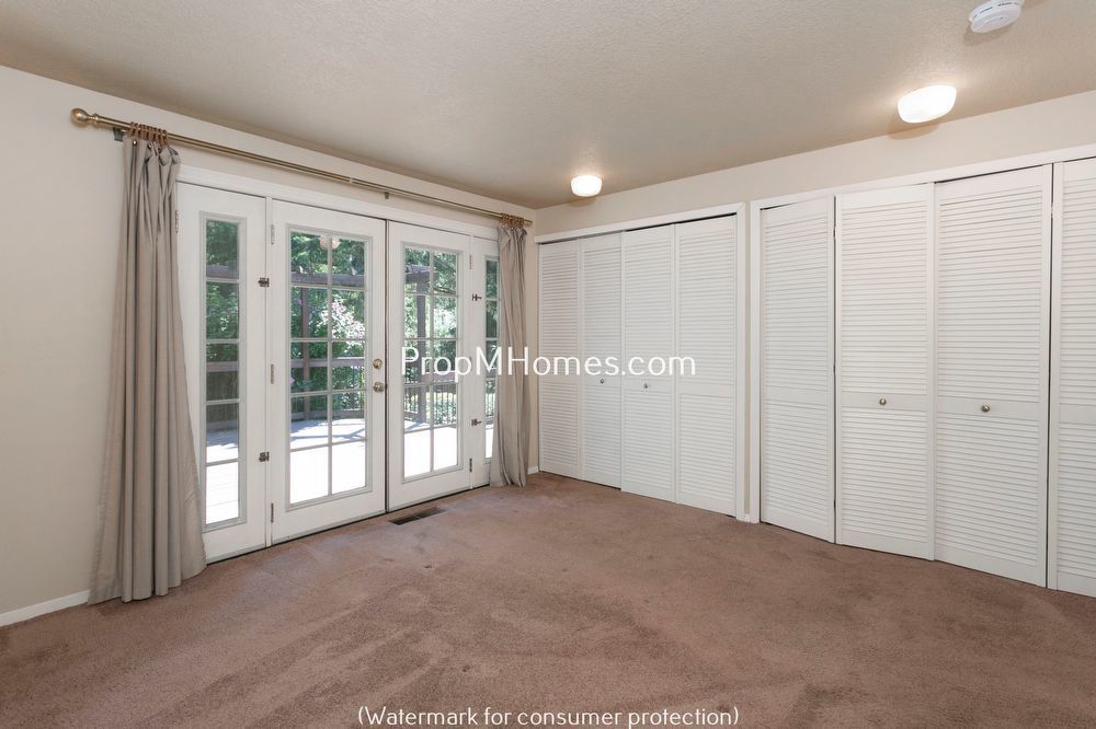 Primary suite with French doors opening to the fenced backyard and deck
