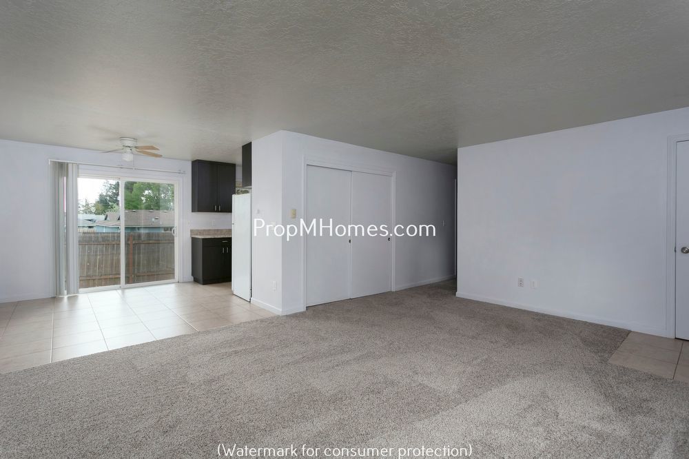-Spacious living room with plush carpeting, large picture window, and ample storage
