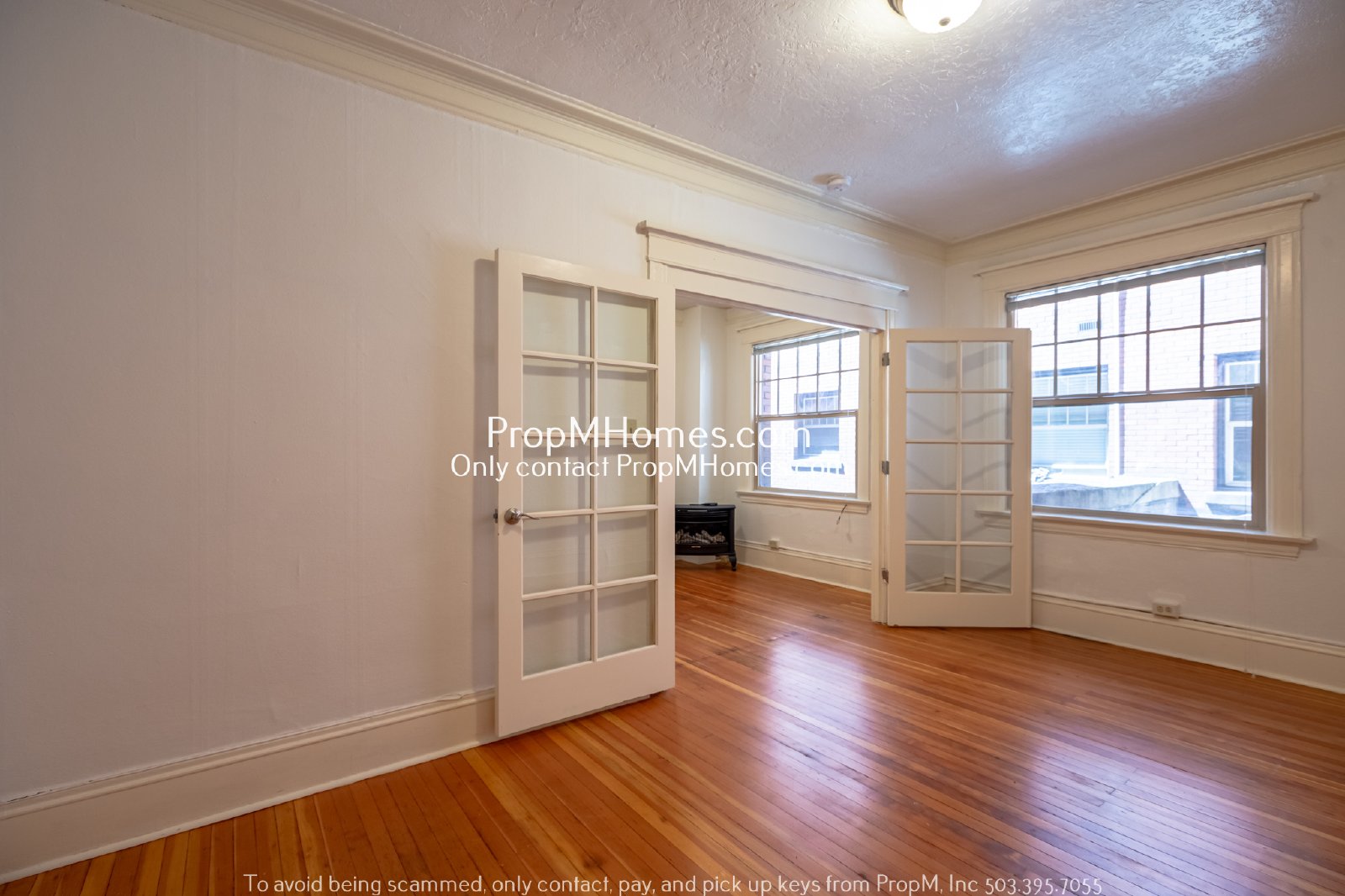 -Bedroom with hardwood flooring and double French door entry