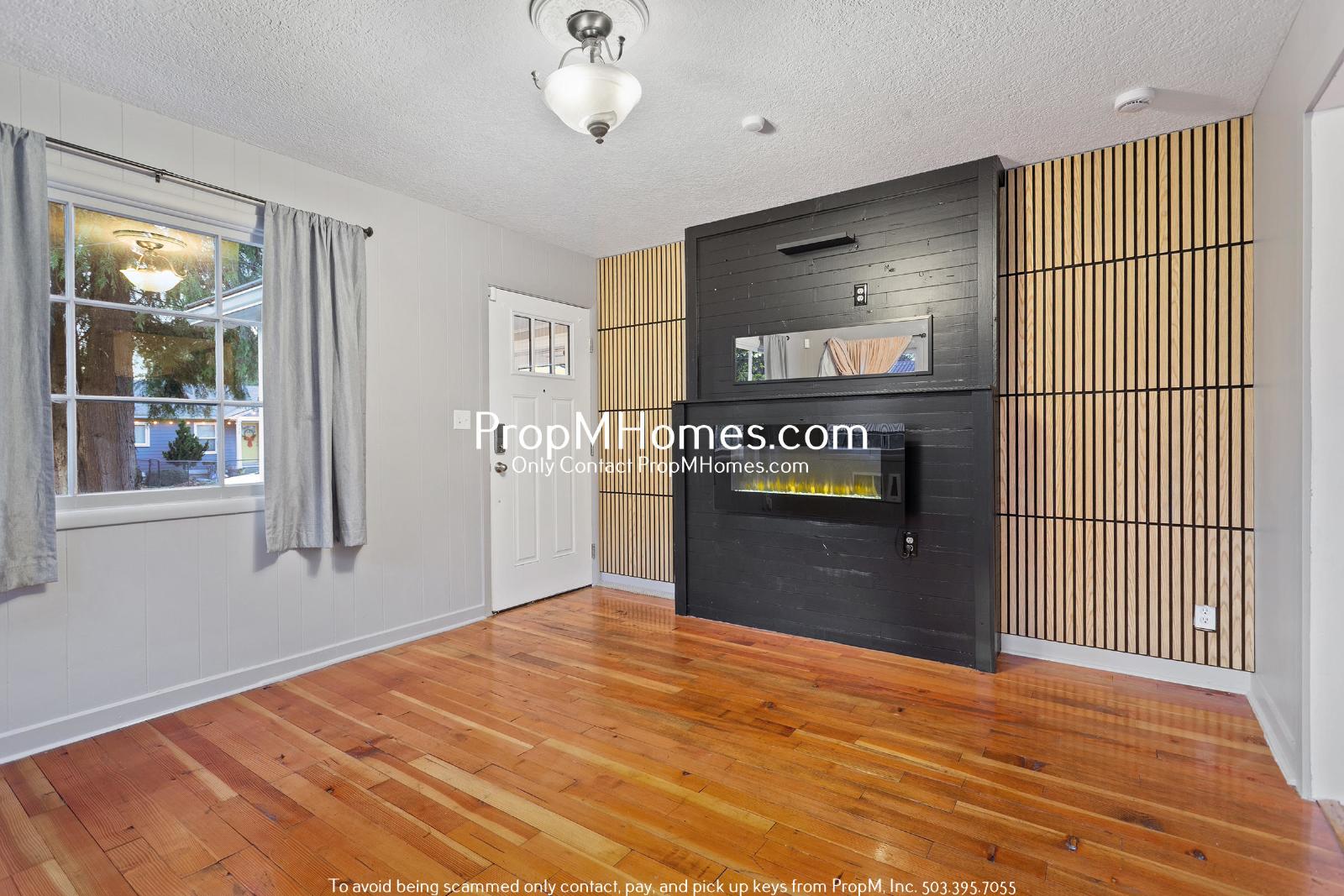 -Spacious and inviting living area with hardwood floors and an electric fireplace framed by a wood surround