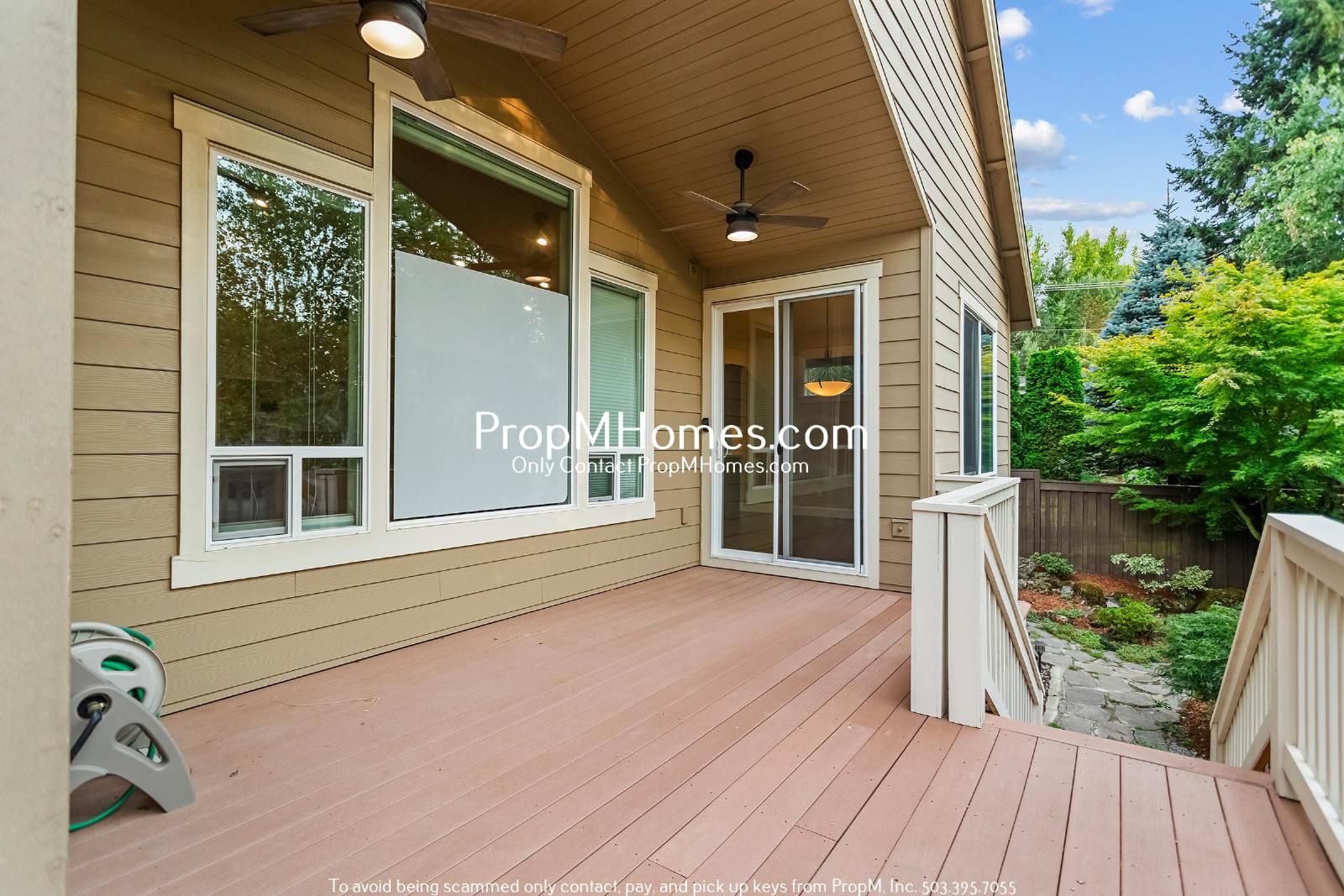 -Covered back deck with ceiling fans and landscaped yard, perfect for relaxing or entertaining