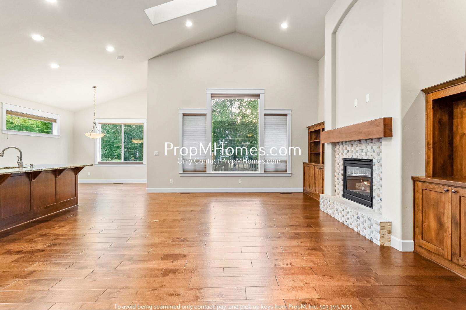 -Expansive open-concept living area with vaulted ceilings, hardwood floors, and gas fireplace with built-ins