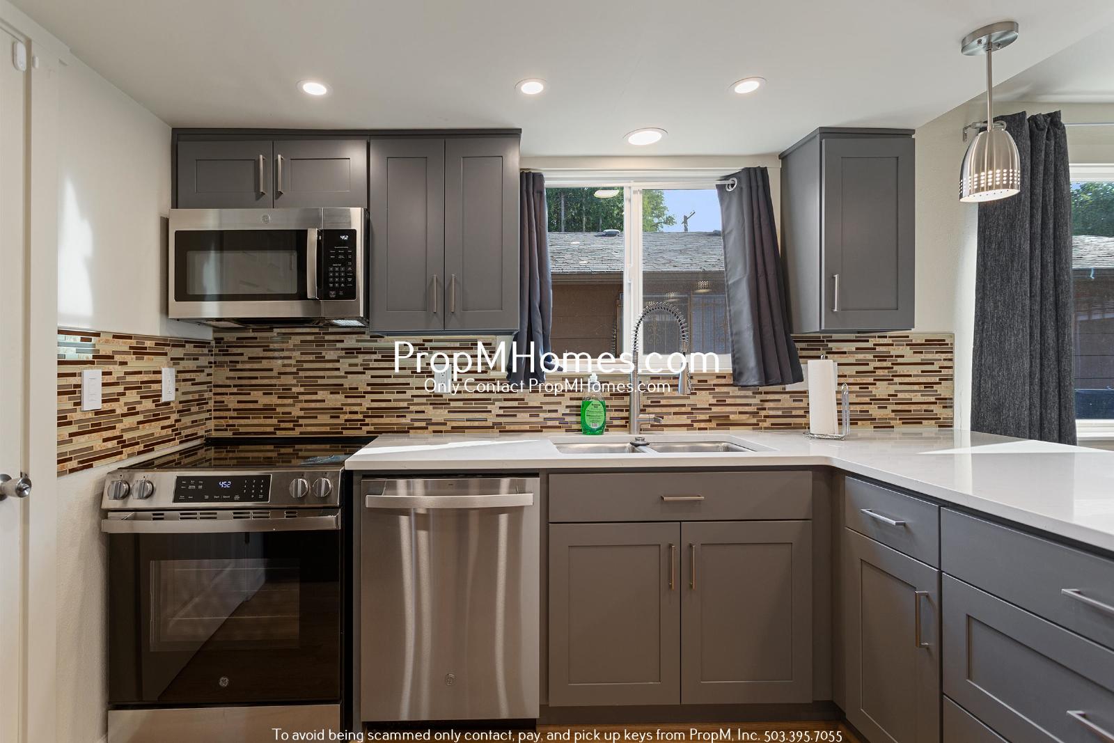-Appliances include stainless steel refrigerator, electric stove/oven, microwave, and dishwasher