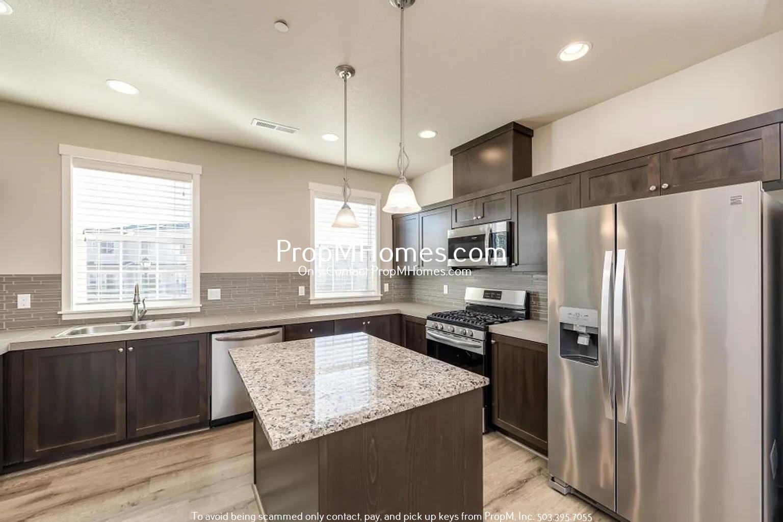 -Stainless steel appliances including refrigerator, gas range, microwave, and dishwasher