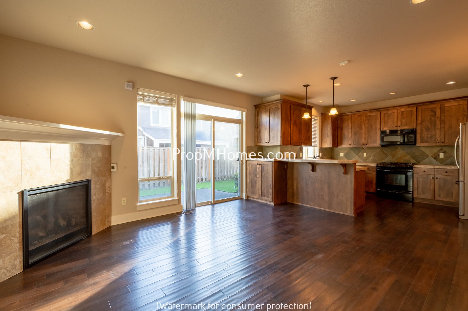 -Great room layout with wood floors, gas fireplace, and open flow between living, dining, and kitchen—perfect for entertaining
