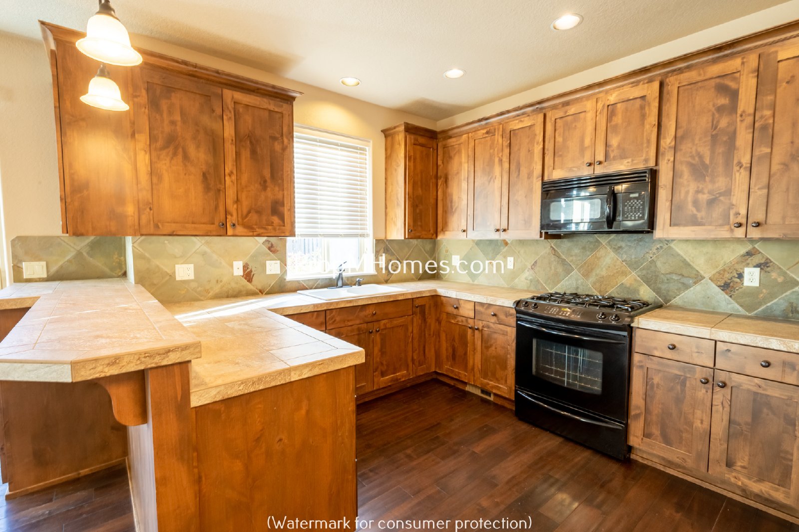 -Kitchen with custom cabinetry, tile counters and backsplash, breakfast bar, and appliances including refrigerator, microwave, gas range, and disposal
