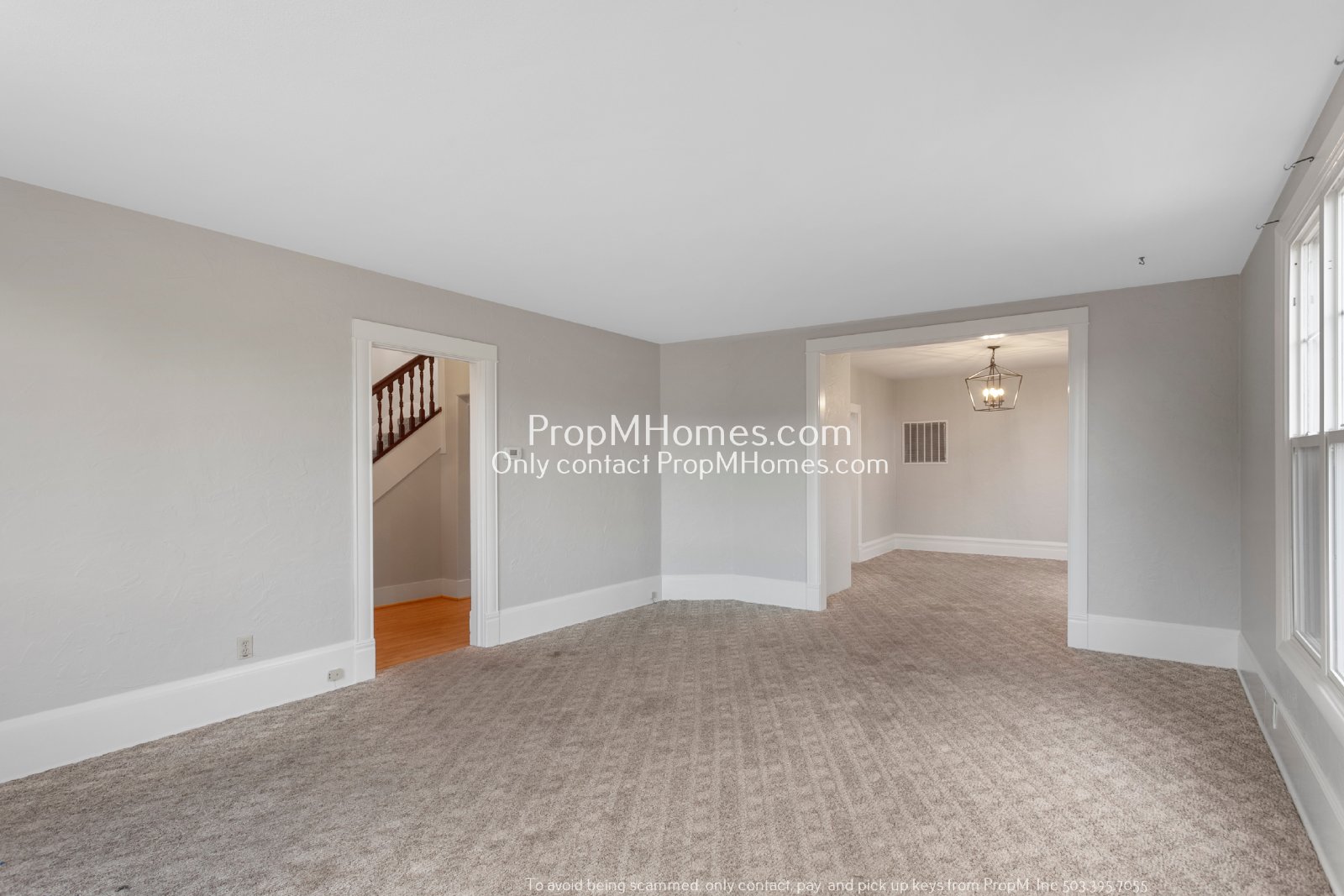 -Generously sized living room with high ceilings, plush carpeting, and large windows