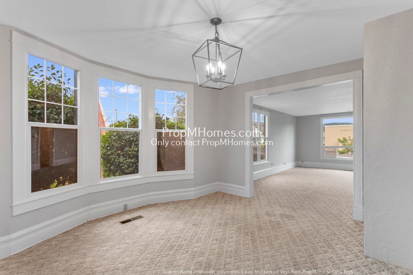 -Defined dining area with modern lighting and charming bay window