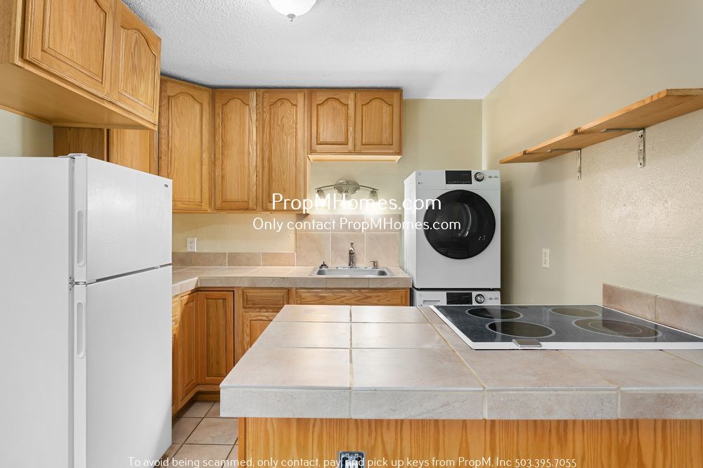 -Kitchen with tile counters, wood cabinetry, and white appliances: electric range, dishwasher, refrigerator/freezer